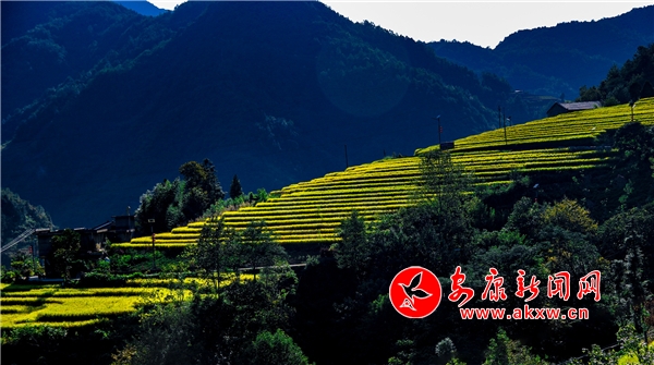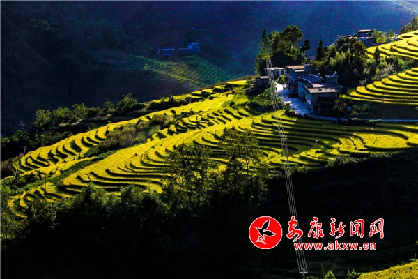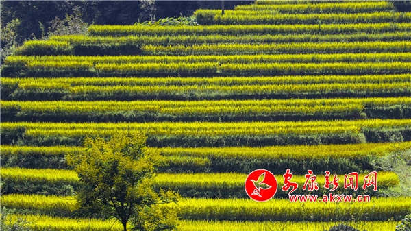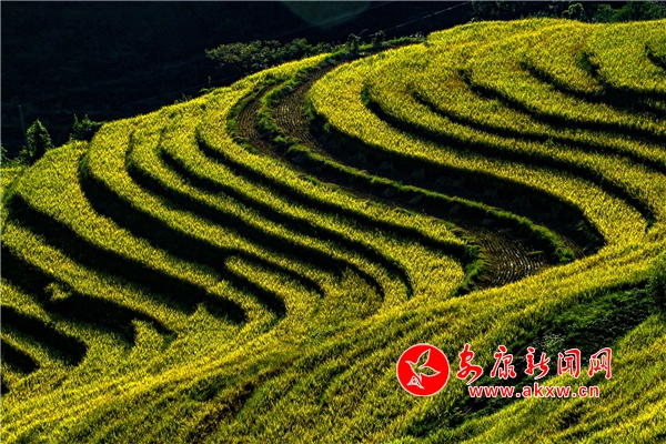 放眼望去,黃亮亮的稻谷,層層疊疊,從山底一直鋪到半山腰。水田都是依山而修,隨山形而變,高差均是隨坡放緩,形狀雖不十分規則卻也精巧,動人之處全在自然的水平線上。