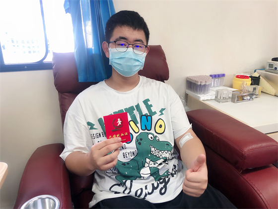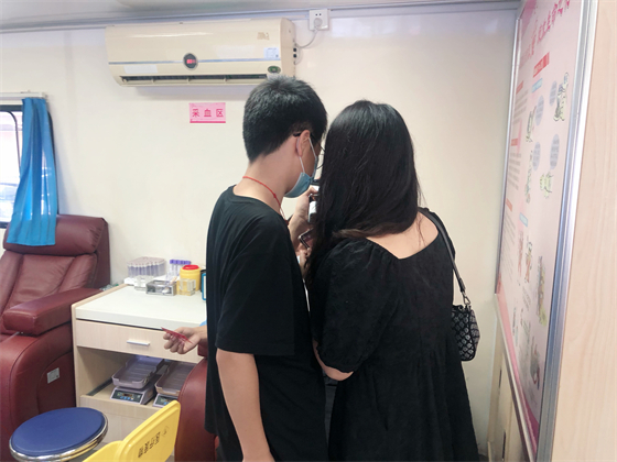 中秋節不僅街上熱鬧,獻血車上也熱鬧,鄧孟杰正坐在采血椅上獻血,他漂亮大方的女友站在旁邊跟他聊著晚上要吃什么,女友的弟弟坐在遠一點的地方玩著手機,女友的媽媽則坐在體檢桌前測量血壓,“一人獻血,三人陪同”的場景著實有點可愛,但鄧孟杰笑得十分開心,一直想獻血的他特別選了中秋這個日子,大概也是想和愛人親人一起分享這種美妙的人生體驗。鄧孟杰的女友拿起他的獻血證撒嬌到:“這次我們陪你,下次你也要陪我來獻血。”說完把手機塞給了一旁的弟弟,指揮他給自己和男友拍合照,一邊打趣弟弟拍照技術不好一邊把男友手里獻血證的位置調了又調。