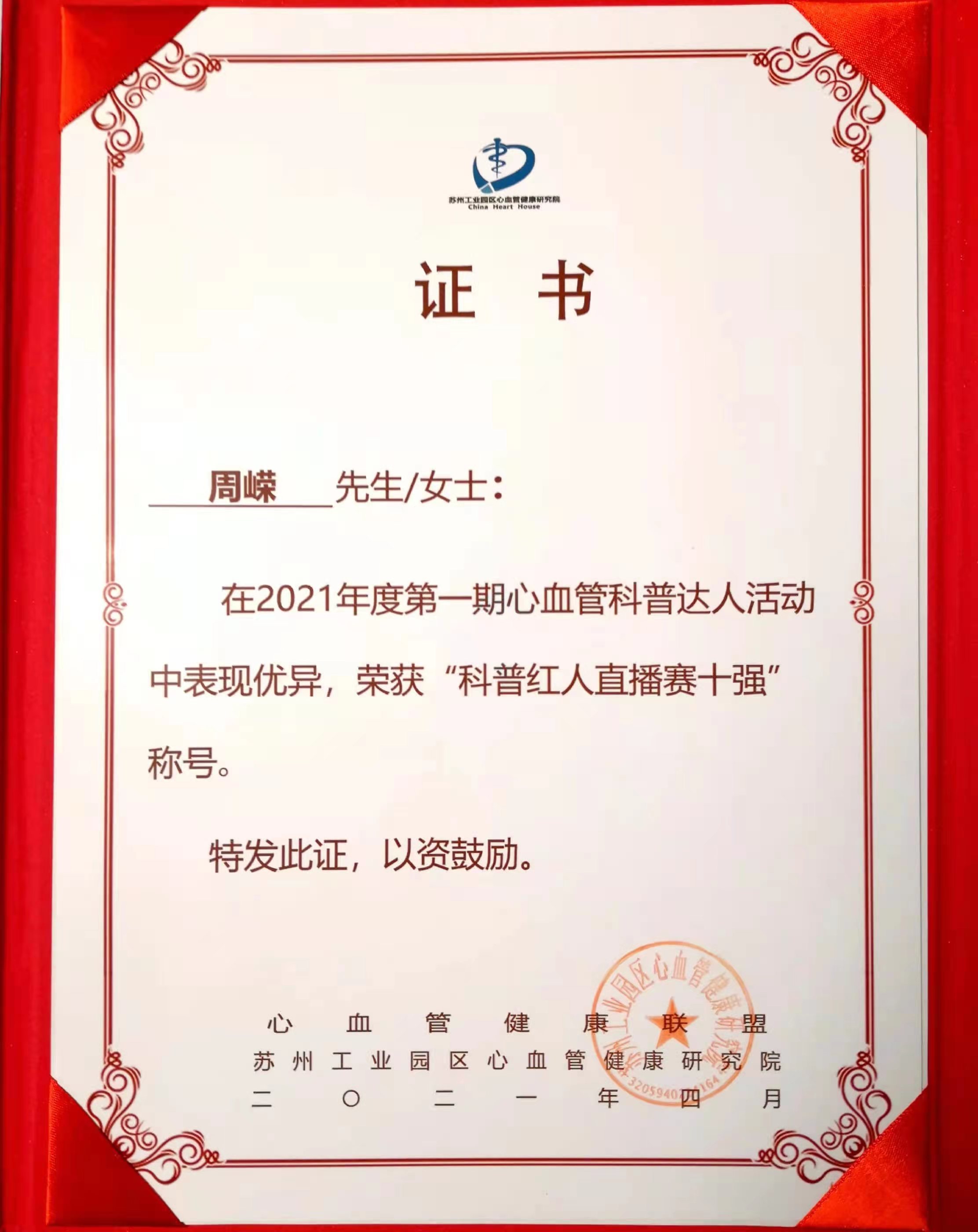 2021年 獲醫生云獎;獲“科普紅人直播賽十強”稱號