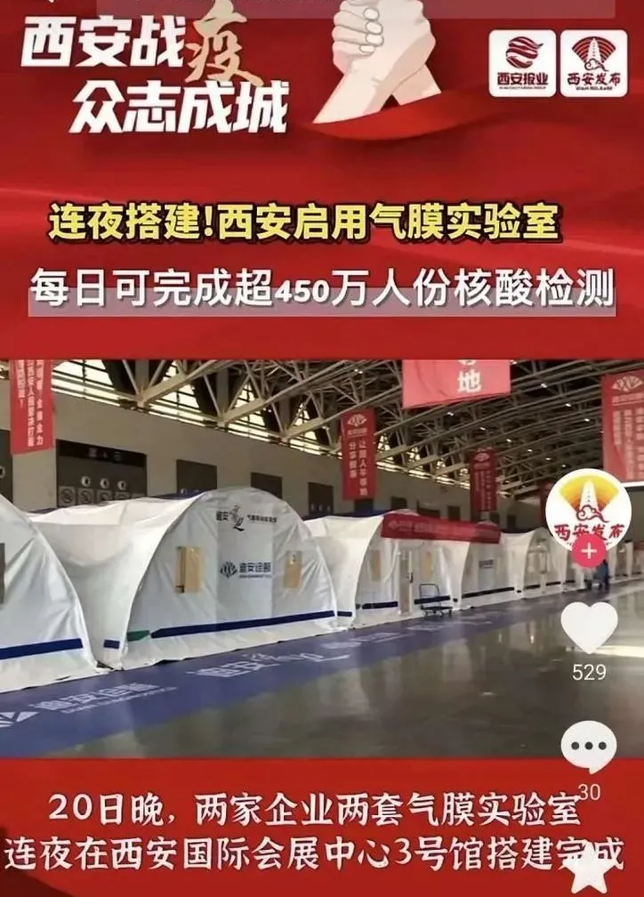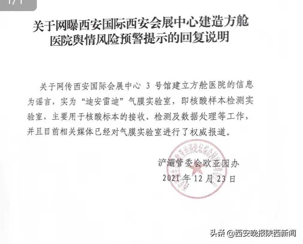 近日,短視頻平臺有網民發視頻稱“西安國際會展中心正在建方艙醫院”,經核實,該信息為謠言,實為“迪安雷迪”氣膜實驗室,用于核酸檢測工作。