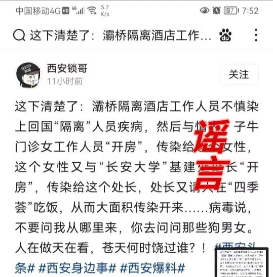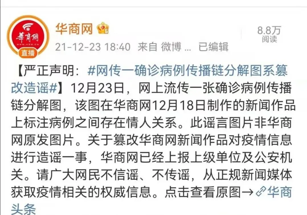 網上流傳一張確認病例傳播鏈分解圖,在病例之間標注“情人”關系,并傳言此次疫情傳播因素之一,是因為西安首例病例與子牛門診的護士為情人關系,導致疫情擴散,經核實,該圖盜用華商網12月18日制作的新聞作品圖片。該信息為虛假信息,造謠的人已被拘留。
