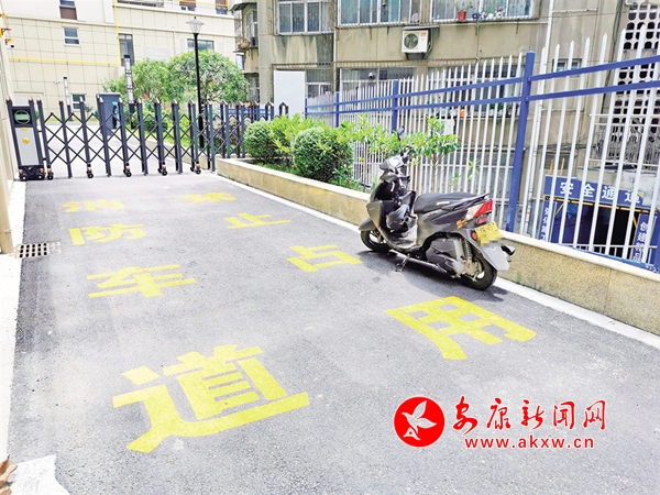 ?6月22日,安康城區江北江華公司消防通道被摩托車占用(圖1),這一區域的人行道盲道也被各種車輛侵占(圖2),存在安全隱患。(記者 潘潤生 攝)