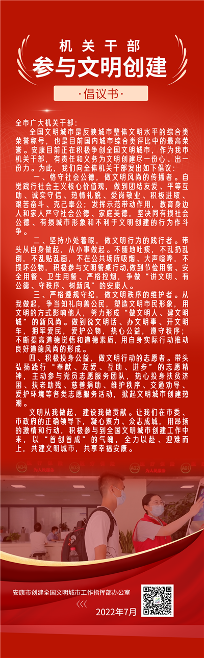 全國文明城市是反映城市整體文明水平的綜合類榮譽稱號,也是目前國內城市綜合類評比中的最高榮譽。安康目前正在積極爭創全國文明城市,作為我市機關干部,有責任和義務為文明創建盡一份心、出一份力。為此,我們向全體機關干部發出如下倡議: