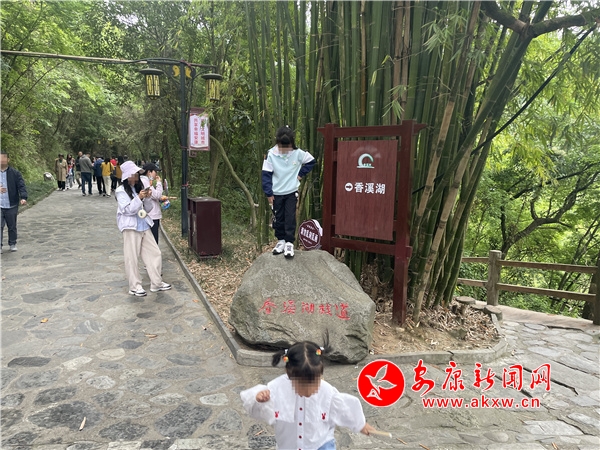 “樓閣云中建,竹木藏山巔。”“五一”期間,風景優美、距離城區較近的香溪洞風景區也迎來了“游客潮”。在眾多自覺遵守文明出行規則的游客中,一孩童隨意踩踏在景觀石頭上,和溫馨提示牌上的“愛護環境,文明出行”形成鮮明對比。