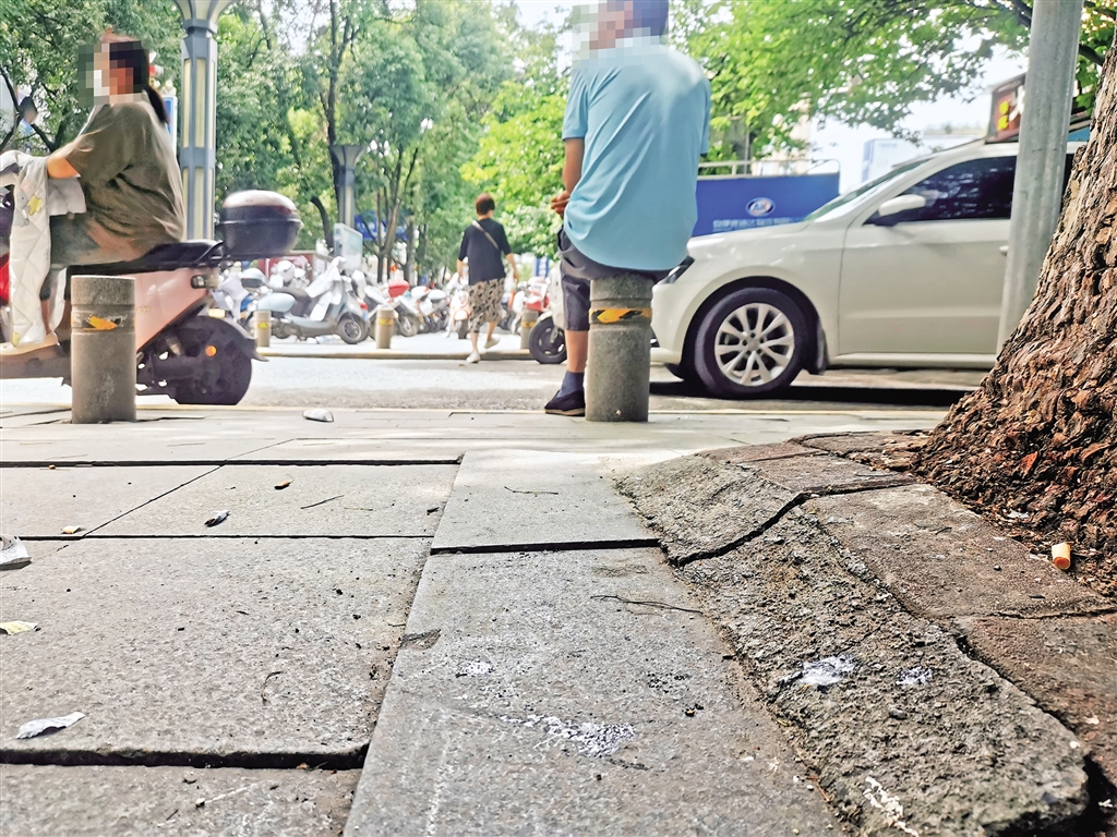 記者在跑街時發現,雖然“文明有我”的公益宣傳深入人心,但是某些不文明行為依然存在。圖為6月19日,安康城區中心廣場西南角路口人行道上的紙屑、煙頭和隨地吐的痰。