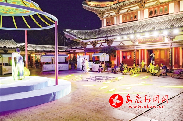 還未走近安瀾樓,就被一首琵琶曲改編的絲竹樂曲《春江花月夜》吸引,流暢多變的節(jié)奏,巧妙細膩的配器,絲絲入扣的演奏,仿佛將觀眾帶入那個月夜春江的迷人景色。環(huán)繞安瀾樓四周,畫家楊炳昌筆下的金州八景,仿佛一秒穿越古今,勝景徐徐、浮現腦際。