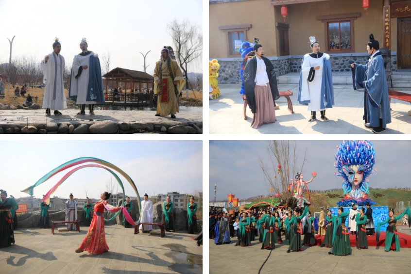 豐收大秧歌、龍騰腰鼓隊、喜慶蓮響、彩船、花轎大聯歡、社火、小場子戲等精彩的傳統民俗節目在桃花源相繼上演。新穎的編排、精彩的表演,令現場游客大飽眼福,叫好聲、喝彩聲此起彼伏。當天近25000余名市民游客前往桃花源觀看表演、打卡游園,處處洋溢著“歡歡喜喜過大年”的節日氣氛。