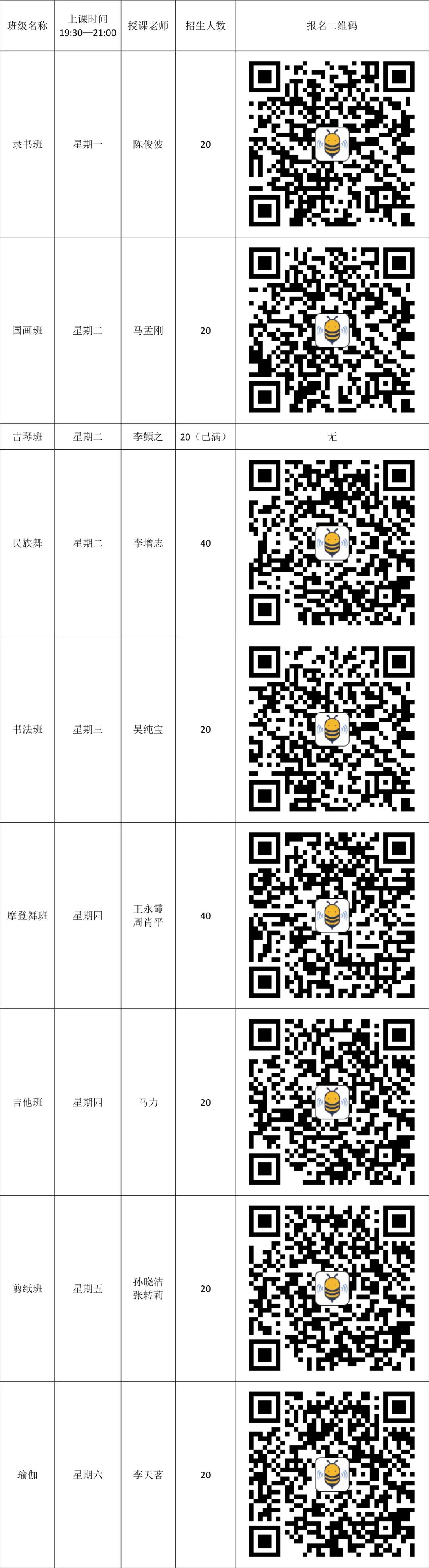 書畫剪紙類四樓書畫室教室、舞蹈類二樓排練廳、吉他四樓音樂教室、瑜伽四樓瑜伽教室、古琴四樓古琴教室