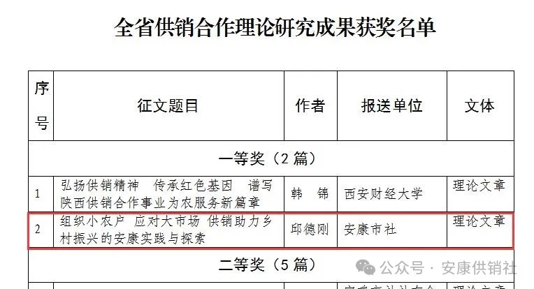 按:本文系安康市供銷合作社黨組書記、理事會主任邱德剛署名理論文章,立足供銷助力鄉村振興的安康實踐與探索,深入闡述了“組織小農戶應對大市場”的內在邏輯,把群眾“組織起來”投身經濟合作的實踐方法,在助力鄉村振興、推進共同富裕實踐中探索出一條可復制可推廣的典型經驗,其理論內涵、實踐邏輯為在推進鄉村振興中更好發揮供銷社的獨特優勢和重要作用提供了有益參考,具有較強的指導意義。該文在中華全國供銷總社和陜西省供銷總社“薪火相傳七十載,砥礪奮進新時代”主題征文中獲評“全省供銷合作理論研究成果一等獎”。