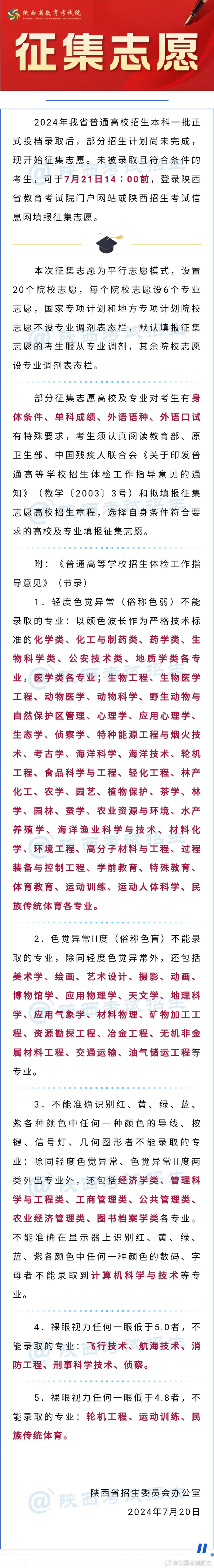 2024年我省普通高校招生本科一批正式投檔錄取后,部分招生計劃尚未完成,現開始征集志愿。未被錄取且符合條件的考生,可于7月21日14∶00前,登錄陜西省教育考試院門戶網站或陜西招生考試信息網填報征集志愿。