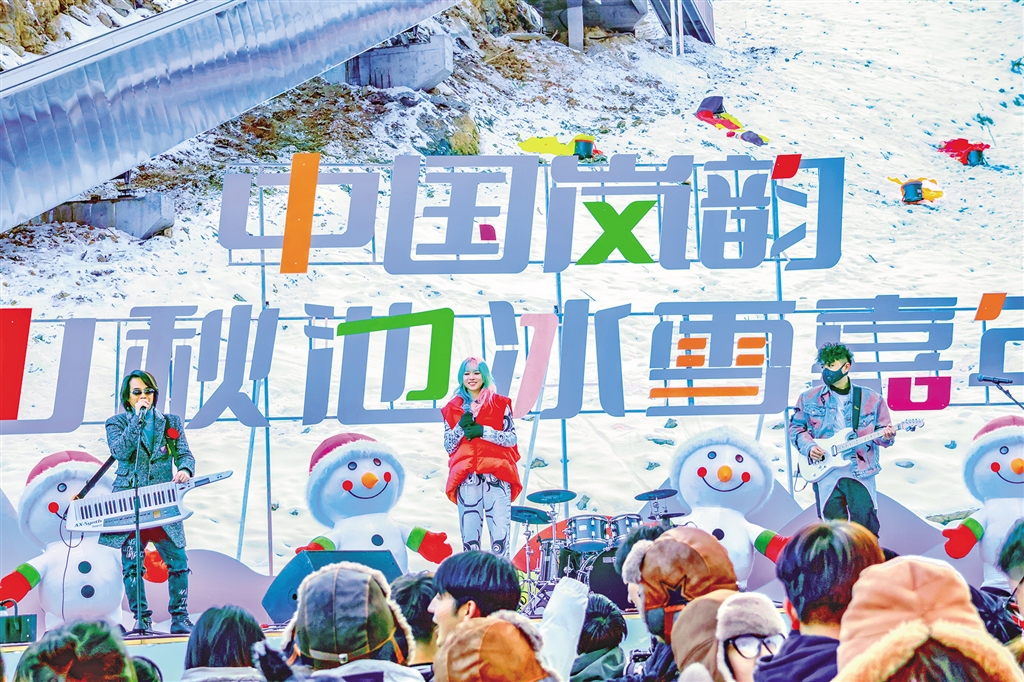 在白雪皚皚與瑤林玉樹交相輝映的雪景勝地,演歌會在唯美動人的開場舞《冰雪奇緣》中拉開帷幕。主舞臺上,勝三分樂隊率先登場,伴隨著強烈節奏的鼓點與電吉他,為觀眾帶來了《你要跳舞嗎》等經典歌曲炒熱現場氣氛。嫂子樂隊作為一支全女子樂隊當仁不讓火力全開,《愛的初體驗》《別問我什么是迪斯科》等動感樂曲徹底點燃觀眾的激情。來自中國臺灣的飛兒樂團重磅登場,為大家帶來膾炙人口的流行名曲《我們的愛》《千年之戀》《Lydia》等歌曲,在現場氛圍的帶動下,游客紛紛揮舞著手中的氣球跟唱,并自發組成游行隊伍,在冰天雪地中放肆歡笑玩樂。演歌會期間還穿插了舞蹈《雪花芬芬》《魅力四射》、小丑表演《金蛇送福》等精彩節目。