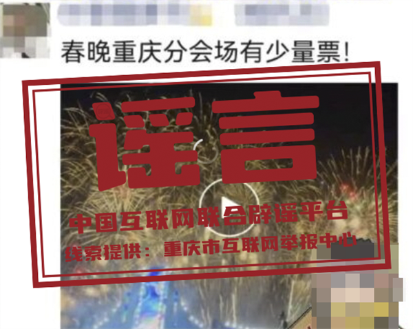 真相:近日,某網民在社交平臺發布信息稱“春晚重慶分會場有少量門票”,引發關注。經核實,網傳信息系謠言。1月24日,春晚重慶分會場工作專班辦公室(中共重慶市委宣傳部)、重慶市公安局聯合發布《重慶市2025年除夕重要活動及臨時管控安排通告》,2025年春晚重慶分會場節目實行無觀眾全封閉制作,不設觀演區、不帶觀眾,不售票、無贈票,未安排焰火表演。同時,公安機關將于1月28日17時起,適時對南岸區、渝中區、江北區部分區域及道路實施臨時管控。目前,造謠網民已接受警方處罰。(來源:“重慶辟謠”微信公眾號)