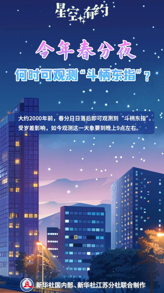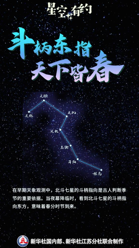 3月20日將迎來春分節氣。這一時節草長鶯飛、花滿枝頭,天上的星斗也指示著春天的到來。我國古代有“斗柄東指,天下皆春”的說法,意思是當夜幕降臨時,看到北斗七星的斗柄指向東方,意味著春分時節到來。