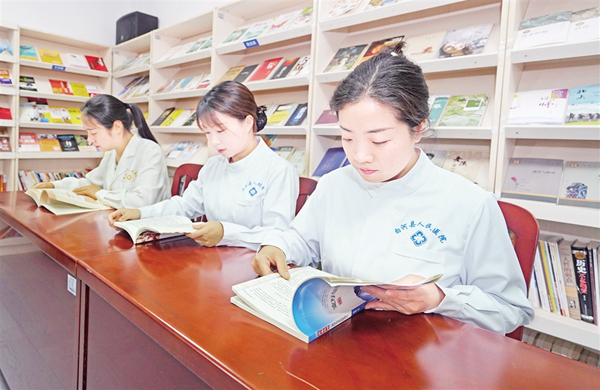 4月23日,白河縣人民醫院護士利用工作間隙在圖書角專注閱讀。(伍渭康 攝)??