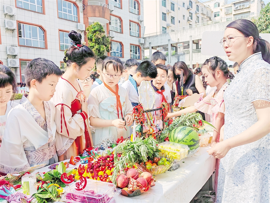 學生們身著漢服與“我們的節日·端午”主題文化節背景墻合影