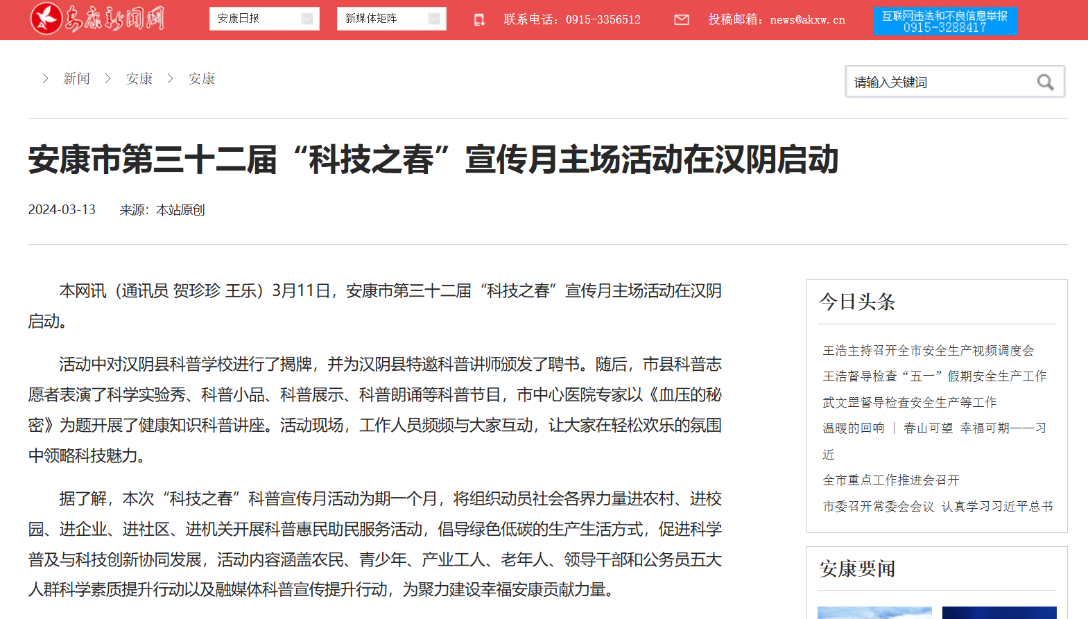 黨的二十大報告指出,培育創新文化,弘揚科學家精神,涵養優良學風,營造創新氛圍。為推動全民科學素質全面提升,鼓勵全社會關注科學創新,形成崇尚科學的良好氛圍,安康新聞網通過“全國科普日集中宣傳”等主題宣傳,持續發布一系列民生科普報道,切實增強科學知識在群眾中的普及率,取到了良好的社會效果。