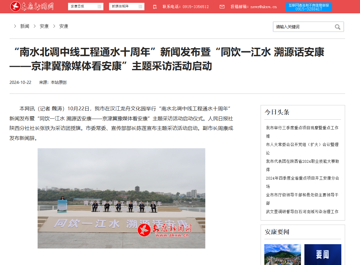 《“南水北調中線工程通水十周年”新聞發布暨“同飲一江水 溯源話安康——京津冀豫媒體看安康”主題采訪活動啟動》(2024-10-22發布)