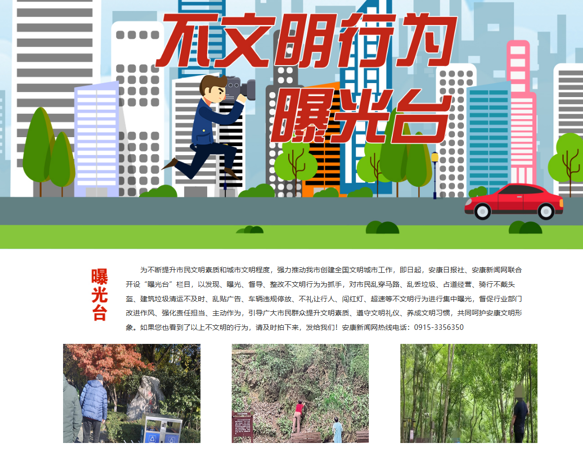 安康新聞網繼續充分發揮輿情監測和輿論監督作用,以高度負責的態度,及時監測上報重大輿情信息。開設《不文明行為曝光臺》輿論監督專欄,集中曝光身邊的不文明現象、行為,發布消息報道19篇,引導市民群眾自覺規范文明行為,主動融入城市文明創建熱潮,為提升市民文明素質和城市文明程度貢獻媒體力量,體現地方黨媒的責任與擔當。