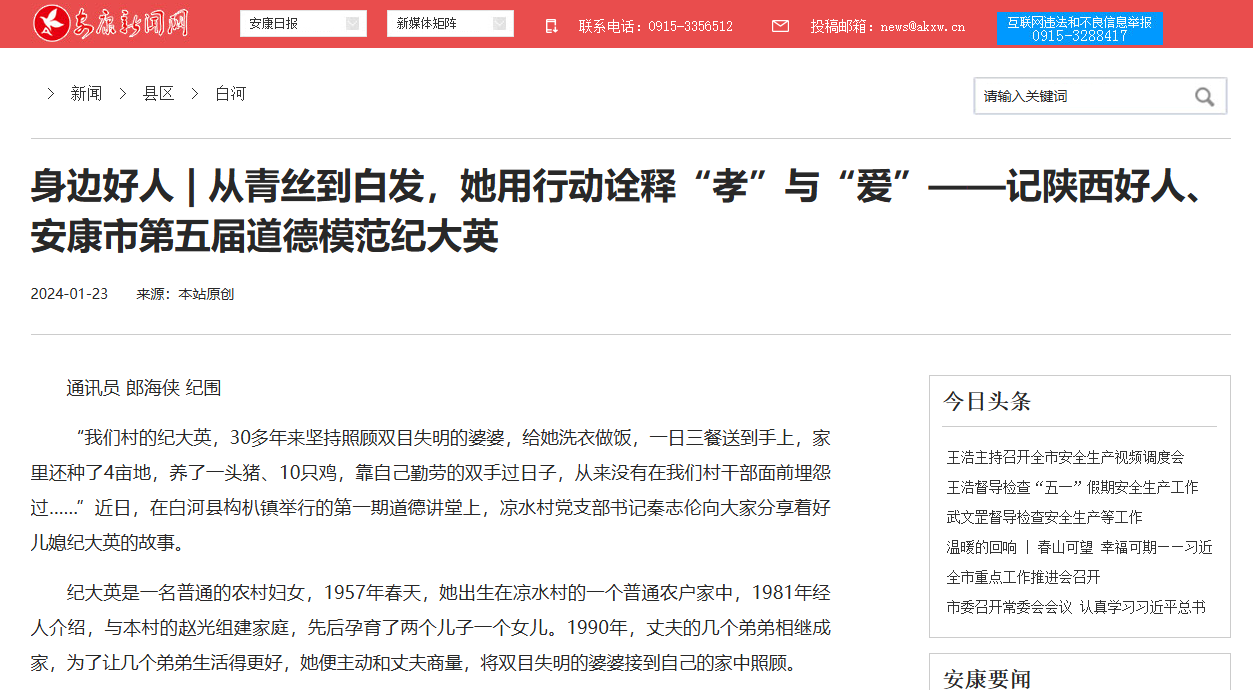《身邊好人 | 從青絲到白發,她用行動詮釋“孝”與“愛”——記陜西好人、安康市第五屆道德模范紀大英》(2024-01-23發布)