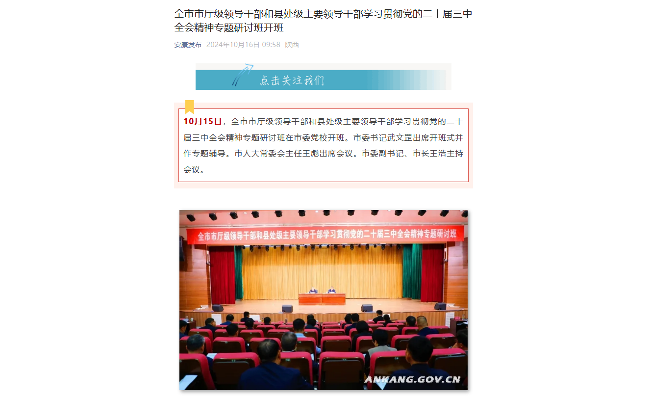 《全市市廳級領導干部和縣處級主要領導干部學習貫徹黨的二十屆三中全會精神專題研討班開班》(2024-10-16發布于安康發布公眾號)