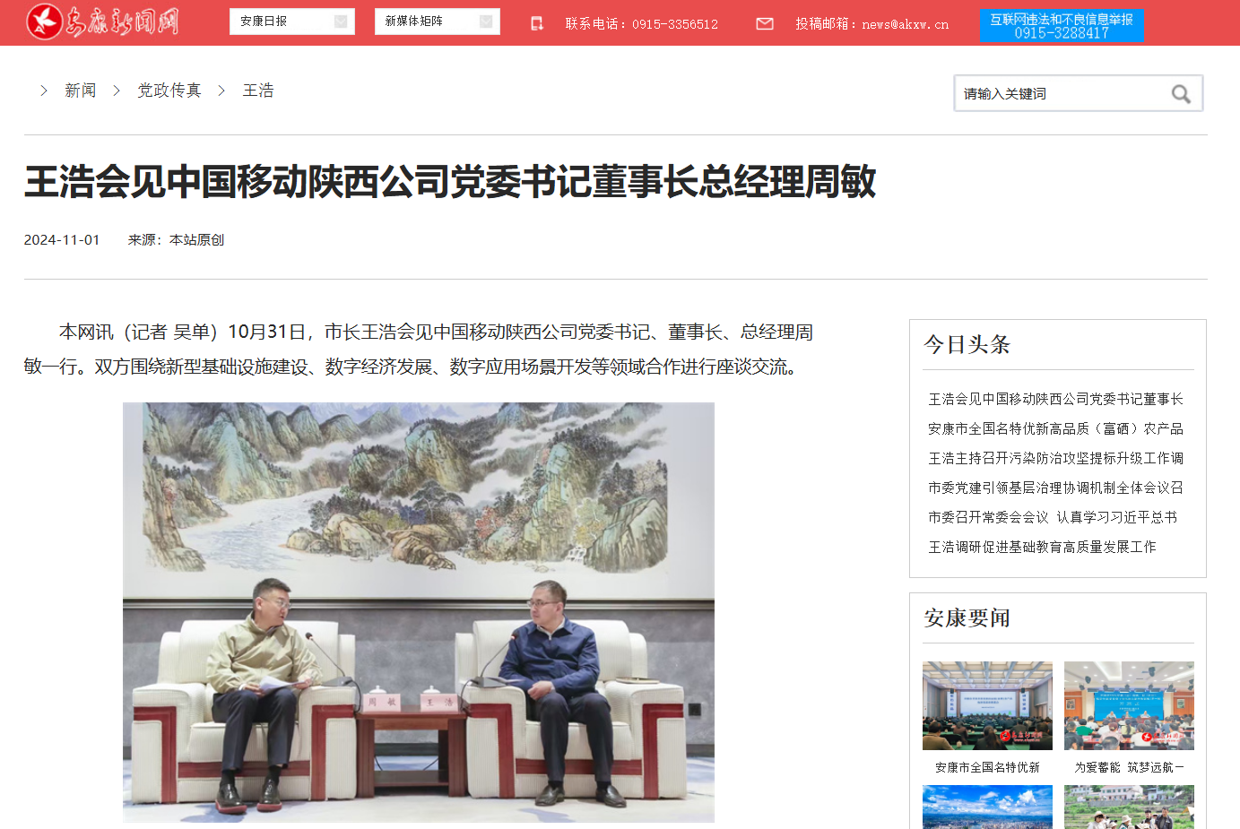 《王浩會見中國移動陜西公司黨委書記董事長總經理周敏》(2024-11-01發布)