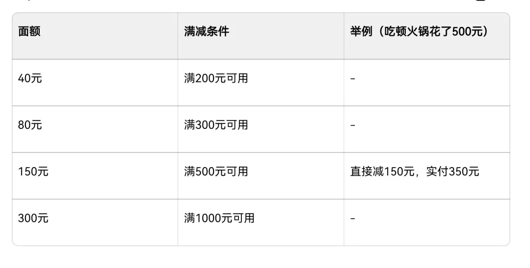 300元面額,餐飲消費滿1000元每次抵用一張。