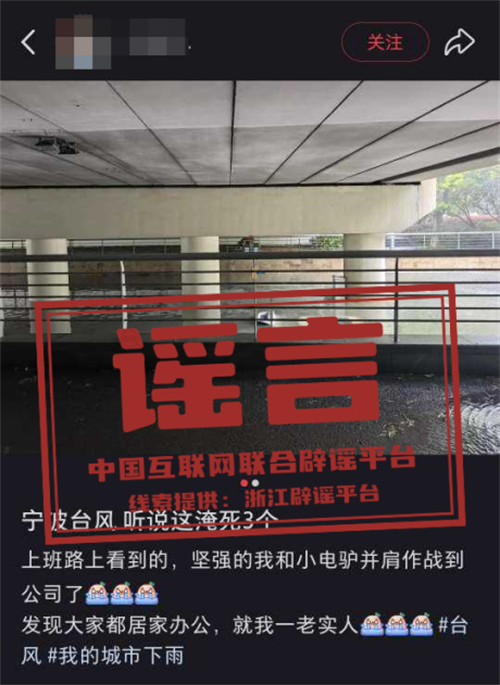 真相:7月30日9時許,某社交平臺網民沈某(女,23歲,寧波鄞州人)發帖造謠稱“寧波一涵洞內車輛被淹,有3人淹死”。經核查,該內容系謠言,目前公安機關已對沈某依法予以批評教育,該帖文現已刪除。