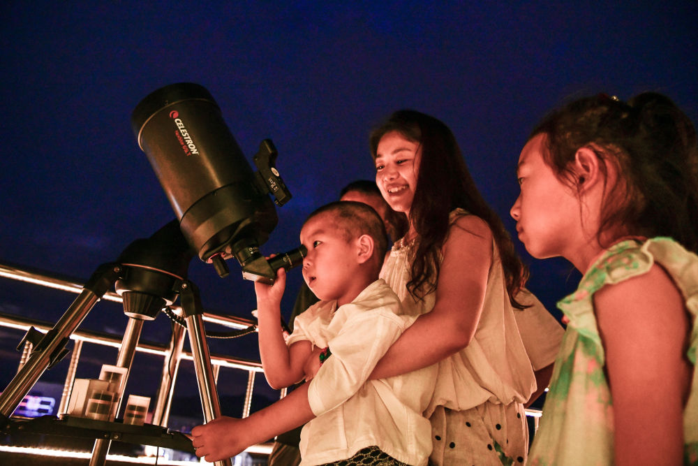 2025年7月9日,游客在貴州省平塘縣克度“天文小鎮”通過望遠鏡觀測星空。近年來,隨著旅游設施逐漸完善,距離“中國天眼”僅8公里的克度“天文小鎮”通過“科普+文旅”發展模式,帶動村民就業創業、增收致富。2025年1月至6月,“中國天眼”景區共接待游客約38萬人次,總收入2496萬余元。