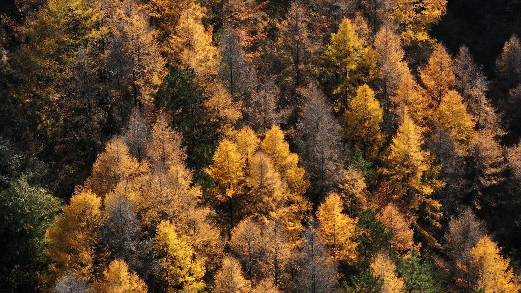 位于六盤山西麓的寧夏固原市西吉縣大寨山林場(chǎng)秋景(無人機(jī)照片)。新華社記者 楊植森 攝