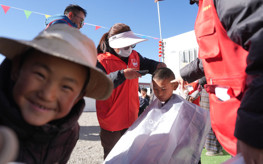 ??2025年1月26日,志愿者在西藏拉孜縣吉如村安置點為孩子們理發。西藏定日縣6.8級地震發生后,志愿者們迅速參與救援搜救、協助搭建帳篷、搬運賑濟物資、協調村民所需。數百名大學生組成志愿者服務隊,白天為安置點的孩子們輔導作業、陪孩子們運動;晚上組成巡邏隊,守護安置點的安寧。
