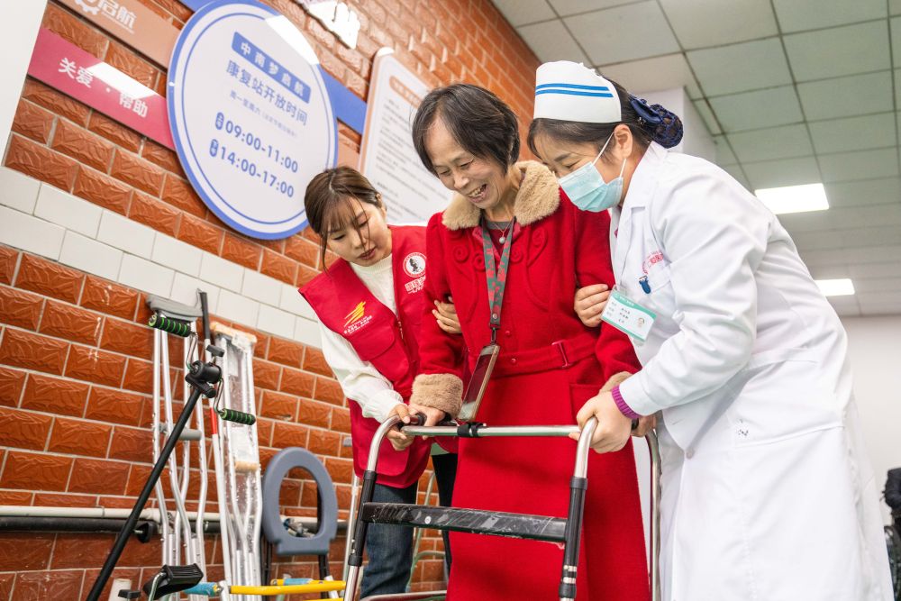 ??2025年11月6日,志愿者及醫務人員在湖南長沙望城區高塘嶺街道中南社區幫助行動不便的居民使用康復器具。