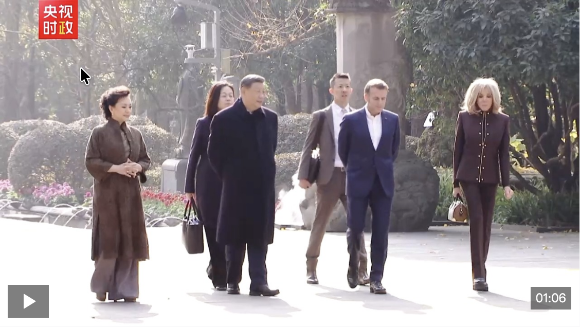 初冬的都江堰,蒼山掩翠。馬克龍夫婦抵達時,受到習近平和彭麗媛熱情迎接。兩國元首夫婦沿堰功道邊走邊談。習近平介紹都江堰歷史和意義,指出都江堰水利工程是全世界迄今唯一仍在使用的古代水利工程,也是人類與自然和諧共生最早的成功實踐之一,修建過程充分反映了中華民族自強不息、不畏艱難、勇于開拓的精神。兩國元首夫婦落座懷古亭,臨水品茗,縱論天下。