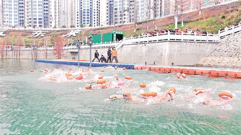 12月21日,陜西省第八屆漢江公開水域冬泳賽在紫陽縣月畔灣廣場水域舉行。當天,來自陜西、湖北、四川、重慶、河南、內蒙古自治區的44支代表隊400余名運動員報名參賽。(儲茂銀 攝)