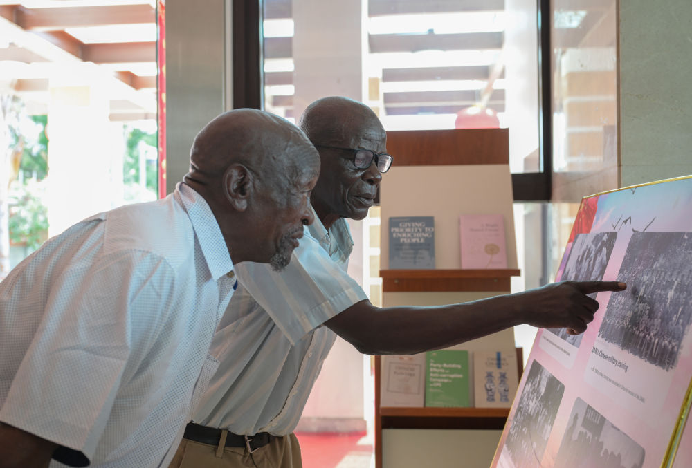 1月28日,在津巴布韋首都哈拉雷的中國大使館,兩名曾在中國接受培訓的津巴布韋老戰士在展板老照片上尋找自己。當日,大使館舉行向津巴布韋解放斗爭老戰士轉交習近平主席復信活動。新華社記者 楊光 攝