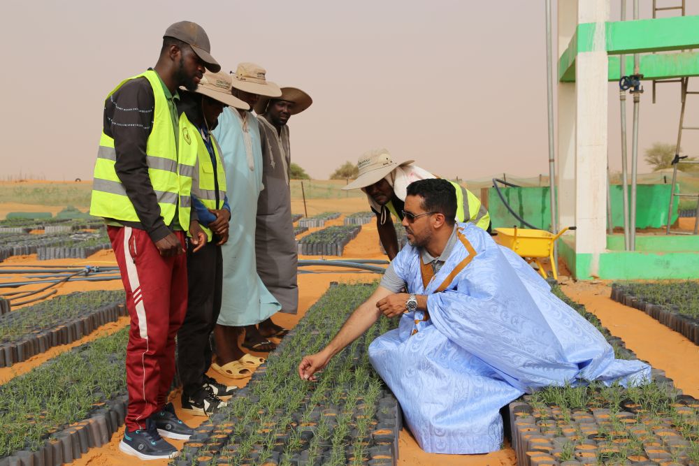 2025年5月22日,在毛里塔尼亞西部特拉扎區比爾·巴爾卡村,中非綠色技術公園毛里塔尼亞示范項目毛方協調員圖拉德·邁杜向工人傳授固沙植物種植技術。新華社記者 司源 攝