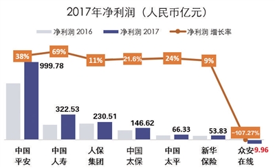 根據業績報告統計:截至2017年底,7家上市保險公司凈利潤總計1810億元。其中,中國平安的凈利潤最高達999.78億元,眾安在線是惟一一家凈利潤為負的公司,為-9.96億元。上市保險公司凈利潤大增的“功臣”是表現不俗的投資收益。