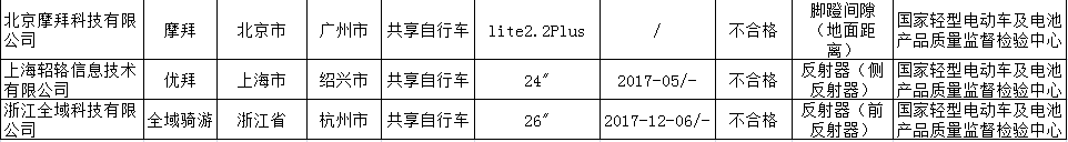 2017年共享自行車產品質量國家監督專項抽查不合格產品及其企業名單(來源:國家質檢總局)