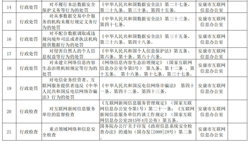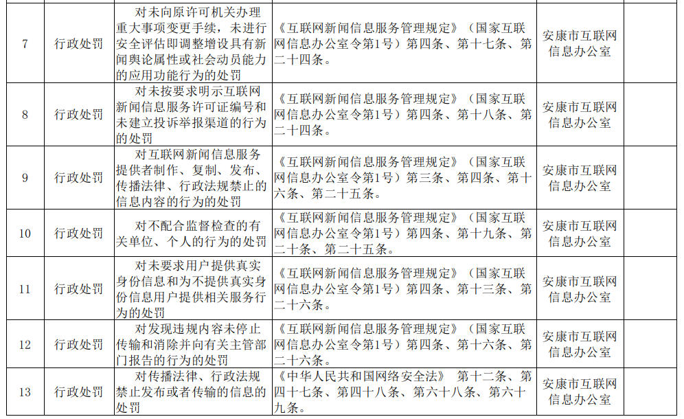 安康市互聯網信息辦公室行政執(zhí)法事項目錄清單