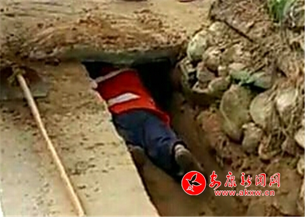 蓋板蓋住的水溝部分形成一個寬約80公分的狹小涵洞,鐵鍬只能鏟出洞口的淤泥雜物,里面的怎么辦?“我身體瘦小,我來!”——道班職工鄭清學(xué)主動請纓,用洋鎬頭一點點將污物往外掏。遇到挖不到的角落,他便用雙手代替作業(yè),每清理完一部分,他就匍匐前進一點,整個身子緊緊貼在溝底,全然不顧臉上、身上滿是厚厚的淤泥。