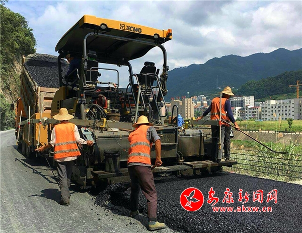 8月2日,筆者來到S308線2018年大中修工程LM—2標段施工現(xiàn)場。剛打開車門,一股熱浪撲面而來。不遠處,引擎轟鳴。運裝瀝青料的車輛來回奔忙,七八名頭戴標志帽,腳穿膠底鞋,揮舞著鐵鍬的工人,正在熱浪滾滾的作業(yè)面旁穿梭忙碌。混合料不斷從攤鋪機上卸下,碰到一些邊邊角角或者機械攤鋪不密實的地方,他們及時用鐵鍬不停補料、找平,清理整形。