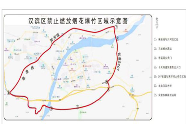 漢濱區禁止燃放煙花爆竹的區域:西起襄渝線與月河交匯處向南至馬坡嶺水源站,南起馬坡嶺水源站、香溪洞頭天門至十天高速安康東出入口,東起207省道與黃洋河大橋交匯處向北至安康東鐵路貨運站,北起安康東鐵路貨運站經陽安線、襄渝線與月河交匯處。