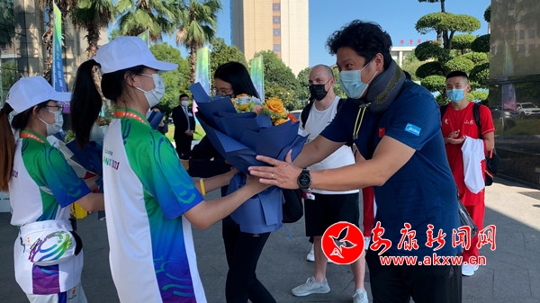 “各位領隊、教練、運動員,歡迎來到陜西省安康市參加十四運會馬拉松游泳項目比賽。我代表競委會向大家表示熱烈的歡迎,祝大家在安康參賽期間工作順利、生活愉快、勇創佳績。”隨后,現場志愿者向報到的運動隊送上鮮花。
