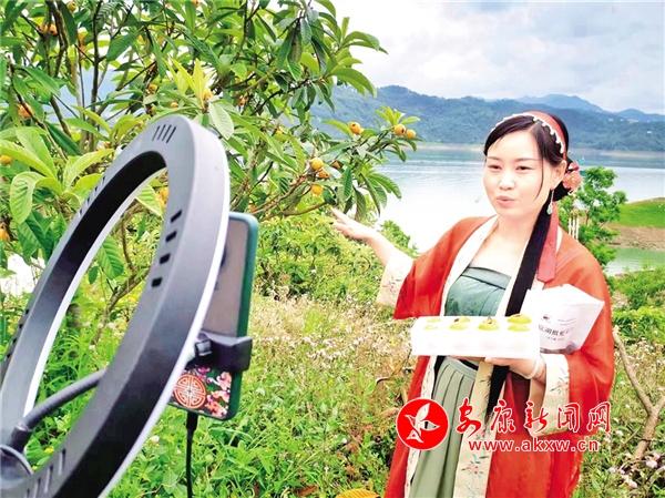 “朋友們,現在正是瀛湖枇杷成熟的季節,這里的農家小院、山坳水岸、田間地頭,隨處可見一樹樹金黃的枇杷,如同一棵棵金蛋蛋掛在枝頭,此起彼伏,正在演奏著季節樂章,美妙無比。”抖音達人“農旅體驗官”王擁邊走邊直播瀛湖枇杷成熟的盛景。