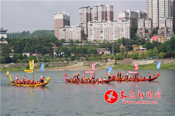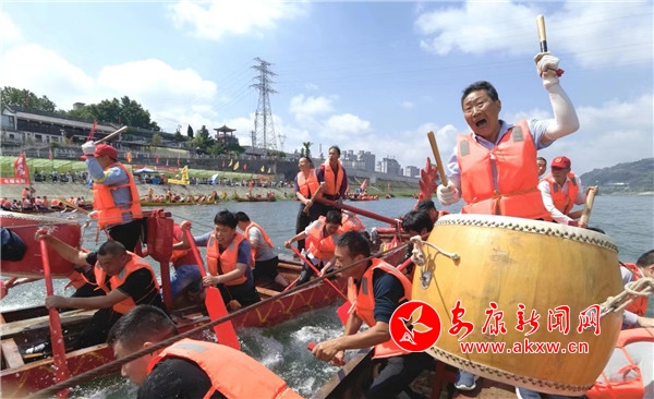 上午10時許,龍舟文化園禮炮轟鳴,數百健兒痛快地飲下“摔碗酒”,隨后依次登上自己隊伍的龍舟。紅色、黃色、紫色的龍舟整齊劃一地停靠在江邊,龍頭高昂,龍尾高翹,槳櫓浮動,旗幟飄揚。聞聲而來的群眾齊聚兩岸,駐足圍觀。總指揮一聲哨響,木槳齊動,龍舟似箭掠過無垠江面直逼江心,留下層層白浪;一艘艘或逆流勇進,或順流而下,或徑直橫渡,瞬間點燃觀眾激情,不時引得大家齊聲吶喊。號子聲、鑼鼓聲、吶喊聲、歡呼聲,此起彼伏,聲聲震天。隊員們跟隨著鼓點賣力地劃槳,舵手隨著龍舟行進的方向不停調整把舵,龍舟的速度不斷加快,再快,更快。
