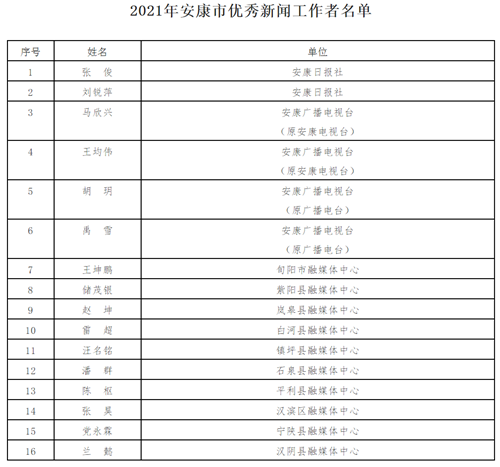 擬授予張俊等16名同志“安康市優秀新聞工作者”榮譽稱號。