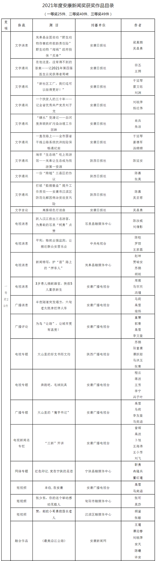 2021年度安康新聞獎評審工作在中共安康市委宣傳部的指導下,由市記協具體組織實施,經過各申報單位推薦,市記協初審、復審并組織專家定評,評選出擬獲安康新聞獎作品114件,其中一等獎25件、二等獎40件、三等獎49件。