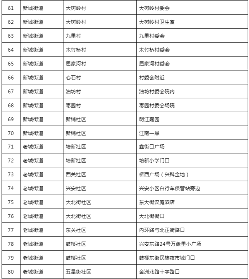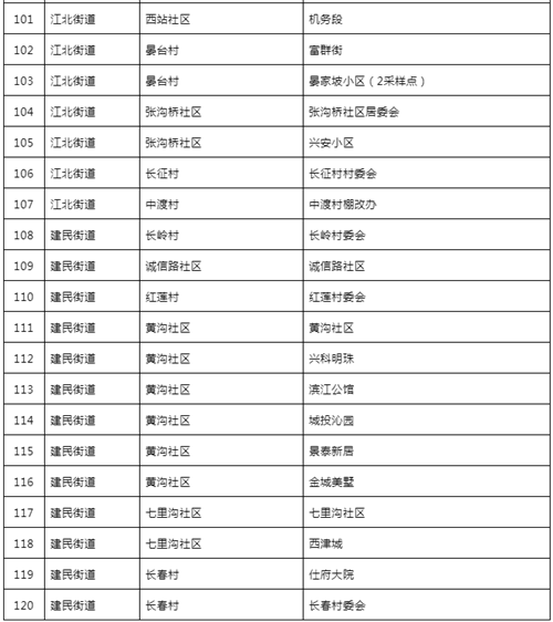 共設(shè)置120個采樣點(見附件),由4個街道辦事處統(tǒng)一安排采樣點設(shè)置、人員組織、秩序維護,檢測對象按照街道辦事處要求,分時段有序到指定地點進行采樣,避免人員聚集。