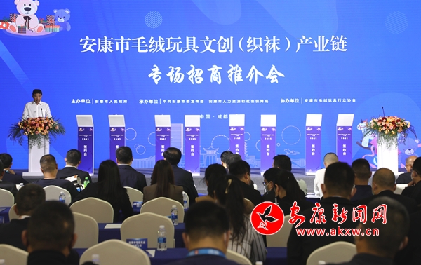 晚秋,蓉城。中國西部國際博覽城9號大廳里座無虛席,氣氛熱烈。2022年11月1日3時許,安康市毛絨玩具文創(織襪)產業專場招商推介會如期召開。安康市常務副市長從中國玩具和嬰童用品協會會長梁梅手中接過“建設毛絨玩具文創產業集群建設突出貢獻獎”的金字牌匾時,大廳里響起經久不息的熱烈掌聲,許多人百感交集。