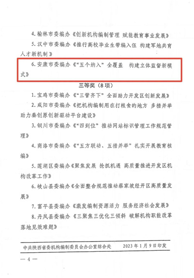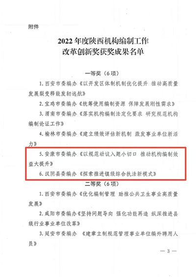 日前,2022年度陜西省機構(gòu)編制工作改革創(chuàng)新獎評選結(jié)果揭曉,入選全省機構(gòu)編制系統(tǒng)20項獲獎成果中,我市3項改革創(chuàng)新成果斬獲一等獎2名、二等獎1名,獲獎等次和數(shù)量位居全省第一。