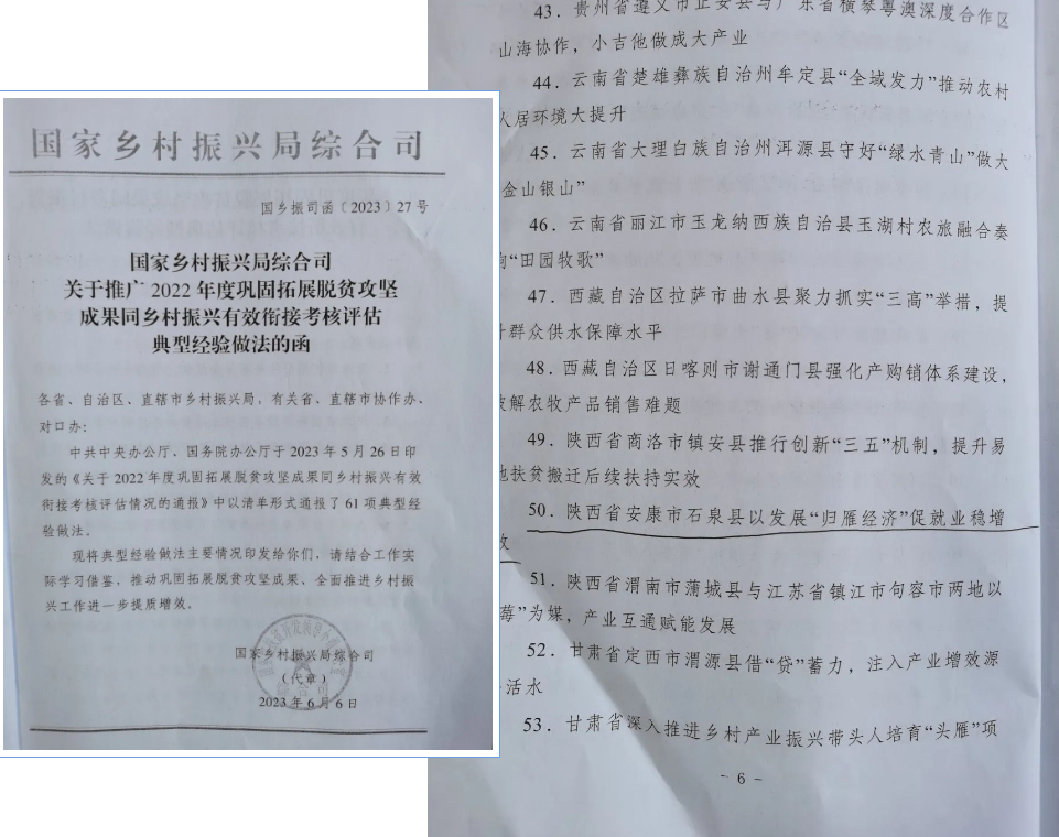 5月26日,由中共中央辦公廳、國務院辦公廳印發的《關于2022年度鞏固拓展脫貧攻堅成果同鄉村振興有效銜接考核評估情況的通報》中,以清單形式通報了61項典型經驗做法,其中“安康市石泉縣以發展‘歸雁經濟’促就業穩增收”成功入選。